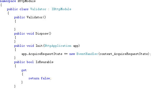 (3)HttpModule模块处理程序:HTTP模块是实现了System.Web.IhttpModule接口的.NET组件。这些组件通过在某些事件中注册自身,把自己插入ASP.NET请求处理管道。当这些事件发生的时候,ASP.NET调用对请求有兴趣的HTTP模块,这样该模块就能处理请求了。