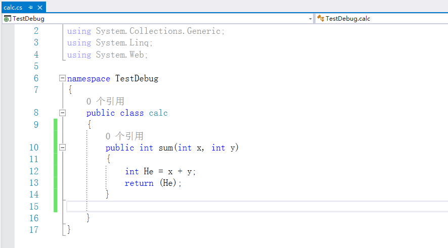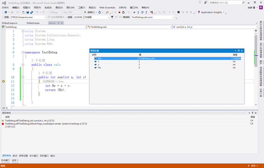 (3)新建Default.aspx页面,双击Default.aspx页面进入Default.aspx.cs,在页面中调用sum函数。按下F5运行项目,在调用函数那行行下断点,然后不停地按F11键,关注在【局部变量】中变量的名称是否有He这个在类中函数中定义的变量,【局部变量】中所监视的变量名称是否发生改变。下图所示的是在按F11键的过程中的一个截图。