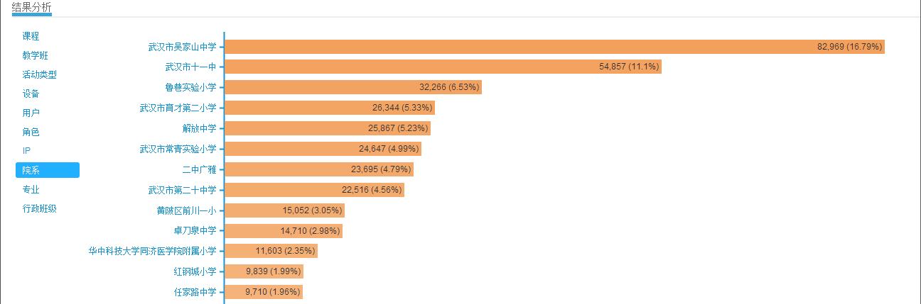 从学校的统计结果来看,武汉市吴家山中学的整体学习量是最高的,数据高达82959,占了总数据比的16%。