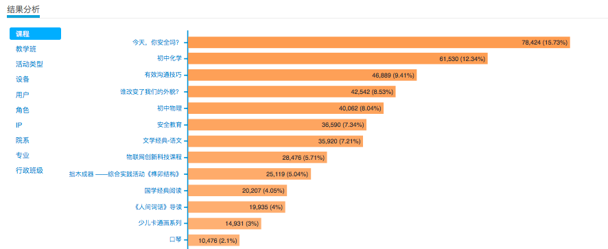 从整体课程的结果分析来看,高中学段中《今天,你安全吗?》这个课程的学习量整体排名第一,数据高达78424次,初中学段中《初中化学》的学习量排名第一,数据高达62530次。小学学段中《物联网创新科技课程》的学习量排名第一,数据也达到28476次。
