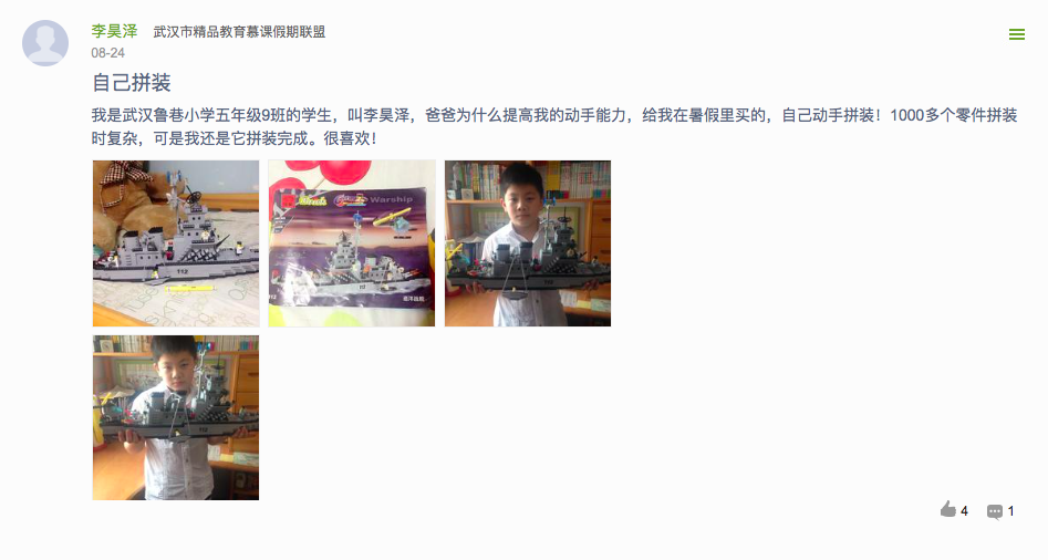 在不少手工课中,很多同学自己动手完成了了不起的拼装,锻炼了自己的动手能力。得到了老师和其他同学的称赞。