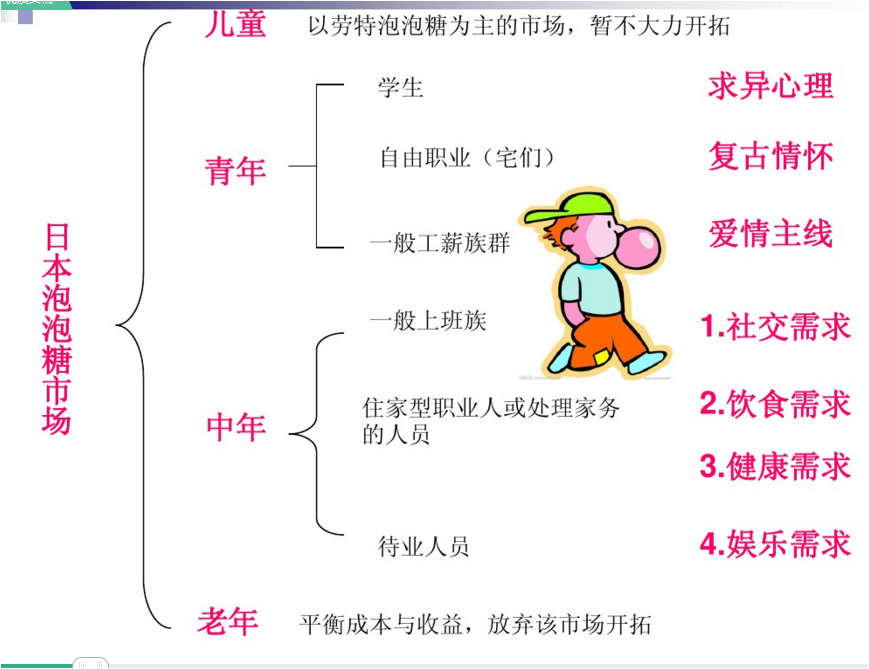 第四,以成年人为对象的泡泡糖市场正在扩大,而“劳特”却仍旧把重点放在儿童泡泡糖市场上。