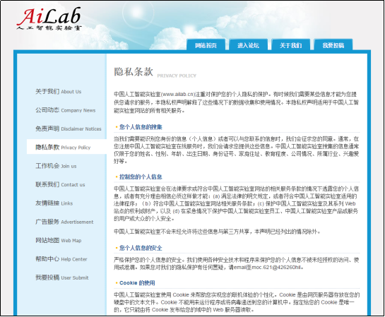 “人工智能实验室”网站[http://www.ailab.cn/]拟定了专门的隐私条款。
