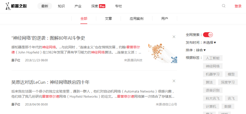 在“机器之心”网上检索“霍普菲尔德神经网络”,返回的结果数量不多,但都是质量高、专业性强的内容,还可以对所有结果按相关度排序,或根据标签来筛选。