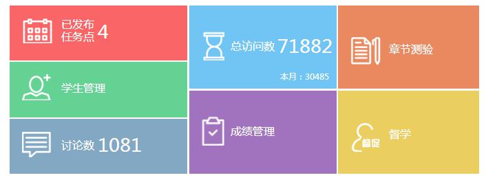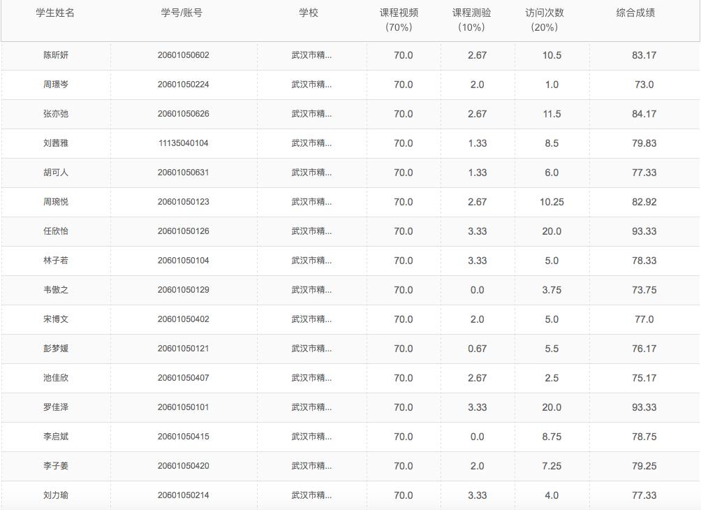 根据统计得知,这门课程总访问数71882人次,报名人数3476个,参与学习人数3378,有效人数3066个,数据统计后合格(60分)人数2700人,优秀(85分)人数270人。
