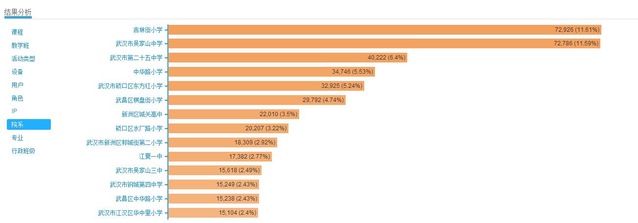 通过整体数据分析,在总共58所参与学校中,吉林街小学在活跃度,任务点完成量,学生访问量上位列第一,武汉市吴家山中学位列第二,因此这两个学校被选为优秀学校案例展示。