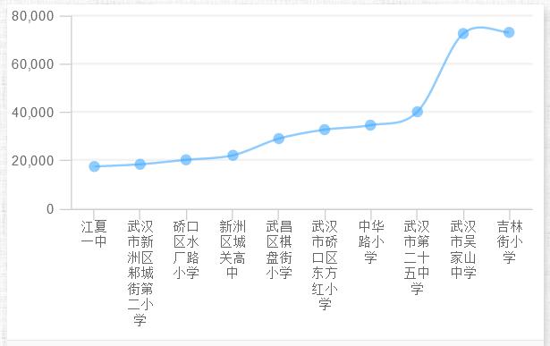 5.结果数据分析,吉林街小学名列第一,武汉市吴家山中学名列第二。
