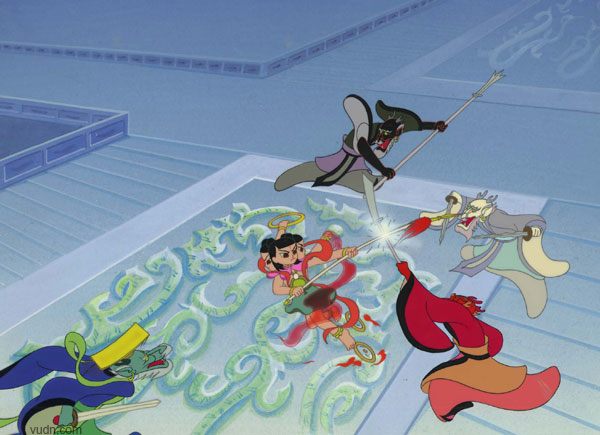 取自于明代神魔小说《封神演义》中的神话故事。因其主角人物——哪吒的天真烂漫与不畏强权精神,备受人们喜爱。故事中因妖龙作祟,残害百姓,引出哪吒大闹龙宫水府。由于此篇故事脍炙人口,几经改编造就了一批动画影视作品。其中上海美术电影制片厂,在上世纪七十年代末创作的《哪吒闹海》,被誉为“色彩鲜艳、风格雅致、想像丰富”的作品,深受国内外好评。至今仍被奉为经典。