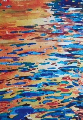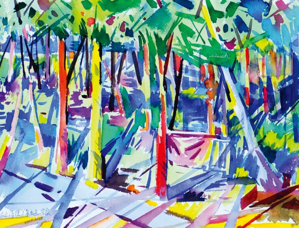 这幅水彩画运用了色彩并置的方法。以朱红、紫红、柠檬黄、湖蓝、酞青蓝、翠绿、青莲等颜色,由大小、形状不同的点、线、面并置穿插,色彩对比强烈,艳丽而跳跃,表现了阳光下树丛色彩的斑斓,富于视觉冲击力。