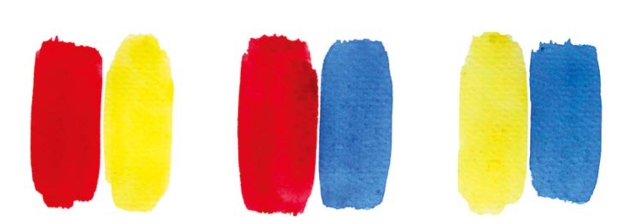红色与黄色、红色与蓝色、黄色与蓝色并置后,会感觉到橙色、紫色、绿色的存在。