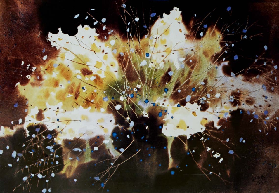 在白色颜料中加入了少许蓝色等,用笔点出了花丛中比较明亮的大小不同的浅色点。