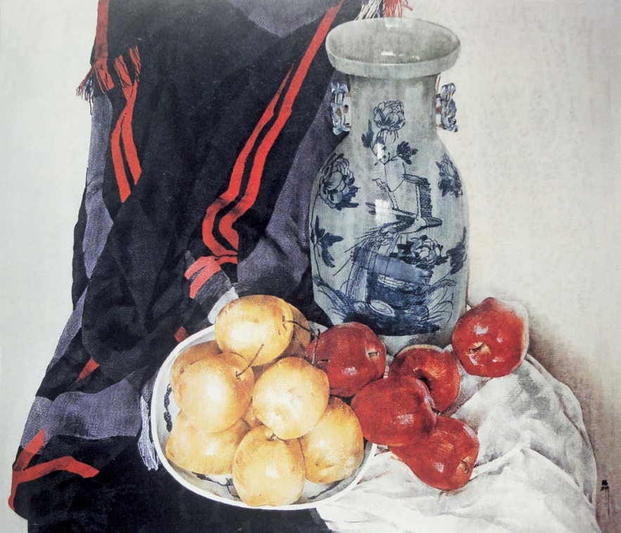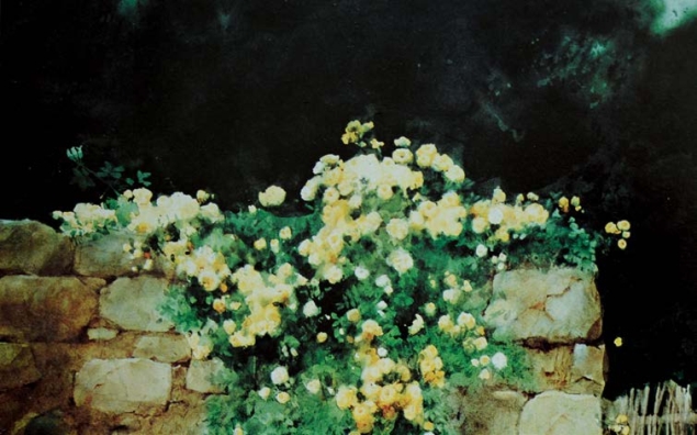 这两幅水彩画中,花丛的墨绿色背景、静物中的黑紫色台布,都加入了水彩颜料中的黑色,使画面深色部分既深暗又滋润,也不失其透明感。