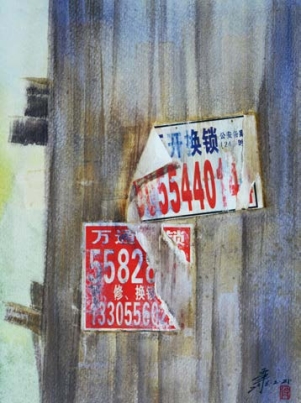 运用干底衔接(见第2例)、干底重叠(见第3例)等技法画木板、背景,对粘贴物进行色彩、虚实等处理,以达到逼真的效果。