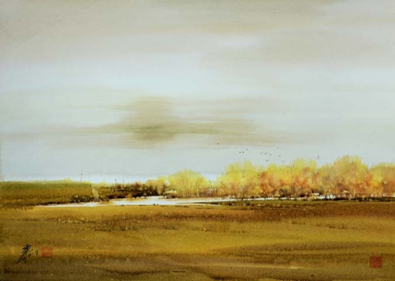 淡淡的云彩是在天空颜色未干时,用方头笔运用轻扫的方法画出。轻薄、透明、柔和的云彩,突显了金秋十月天高气爽的感觉。