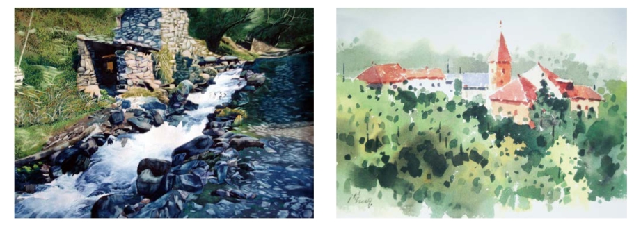 各种笔型与材质的画笔,通过不同运笔方式所产生的点,会有大与小、方与圆、刚与柔的形态和视觉感受的差异。点状笔触是水彩画表现语言中不可忽视的重要元素之一。它可以同较大面积的色块形成对比,使画面灵动起来。