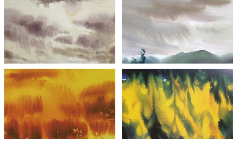 ①纸张要湿润、画板要倾斜,这样,颜色才能在纸面上交融、互渗并根据画板倾斜度的大小、方向形成富有韵味的色彩流动感。