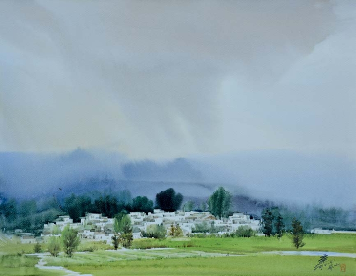 天空、远山运用流动法完成。表现了皖南屏山村微风细雨的景象。
