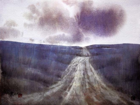 运用干底衔接法(见第2例)画出的天空浅灰紫色湿润时,运用扩散法表现了黄褐、灰紫色的云团。