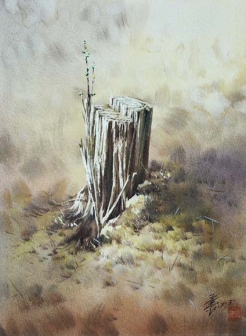 这幅画在以湿底衔接(见第5例)、湿底重叠(见第6例)、留白(见第19例)等技法作画时,用了透明感很弱的土黄、赭石、熟褐等,由于颜料中的含水量比较多,画面的色彩依然感觉比较明快。