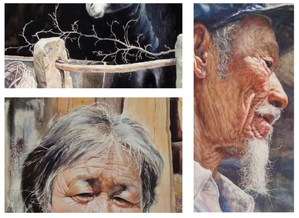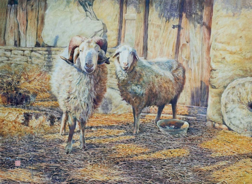 老山羊身上的毛、地面上的干草,均运用了留白液遮蔽法,地面上的干草则是采用多次涂留白液、多次以干底衔接、湿底衔接(见第5例)、干底重叠(见第3例)等技法着色作画完成。因此,画面刻画深入,反映了不同对象的层次和质感。