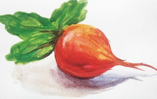 红萝卜的橙色、红橙、黄绿、深绿及投影的灰紫等颜色均运用了皂液法,以干底衔接(见第2例)、湿底重叠(见第6例)等技法完成。