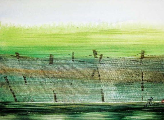 在湿润的灰绿、灰赭色块上,运用窗纱沾印法按压出了隔离网的浅色。