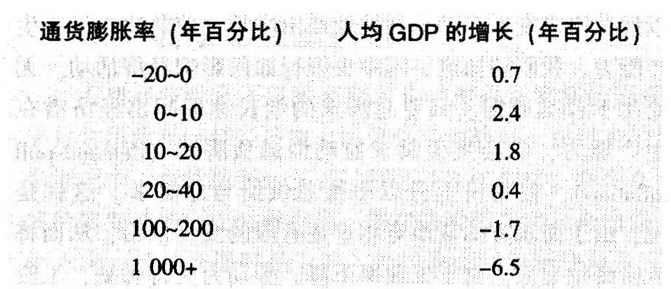 从127个国家综合得出的经验显示:最快的增长与低通货膨胀率相联系。通货紧缩和温和的通货膨胀伴随着缓慢的经济增长。而恶性通货膨胀则与经济大幅下滑并行。