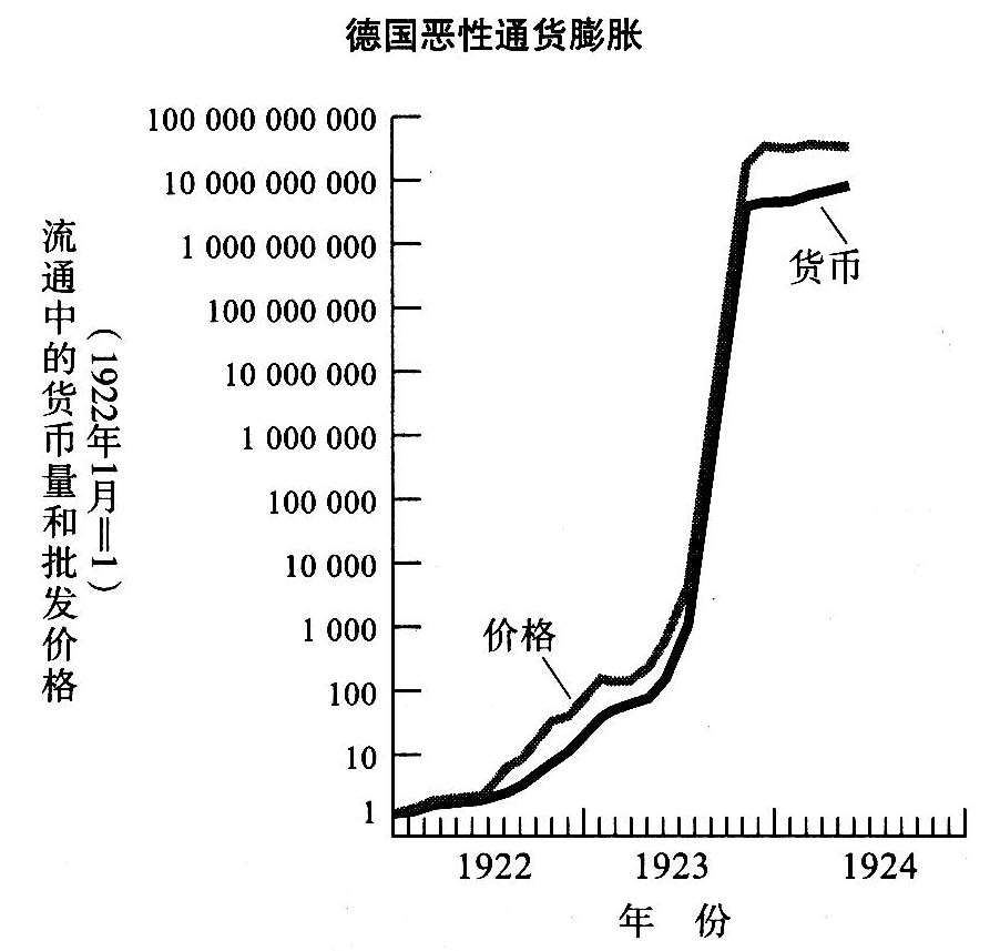 在20世纪20年代初,德国无法征集到足够的税款已偿还政府债务,于是政府便印刷纸币。从1922年初到1923年12月,货币发行量以惊人的速度增长。当国民在贬值前发疯似的抛出纸币时,价格也不断的盘旋飞涨。