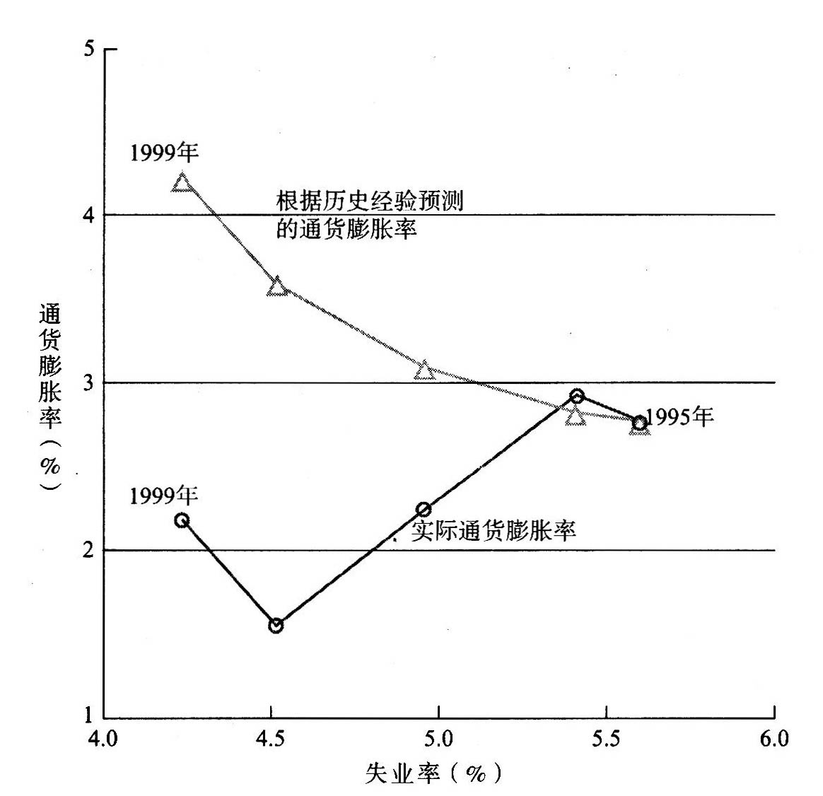 我们可以用菲利普斯曲线来解释这种估算。如果菲利普斯曲线相对比较平坦,则降低通货膨胀率就要以较高的失业率和产出损失为代价;而如果菲利普斯曲线比较陡峭,则失业率的小幅上升就会带来通货膨胀率的快速下降,因而相对来说,降低通货膨胀率的代价就比较小。统计分析表明,当失业率在一年当中高于非加速通货膨胀的失业率1个百分点,而后又回复到原来的非加速通货膨胀的失业率的时候,通货膨胀率将会下降大约0.5个百分点。因此,若要使通货膨胀率降低整整1个百分点,失业率就须在一年内持续地高于非加速通货膨胀的失业率2个百分点。
