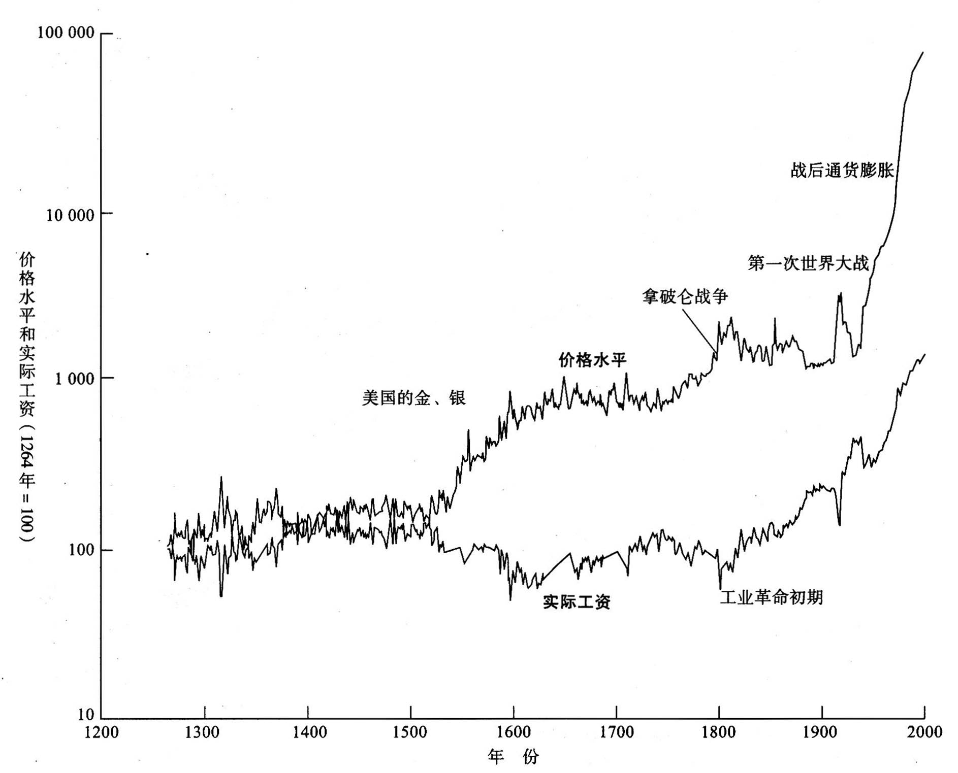 由图可见自中世纪以来英国的价格和实际工资水平变动的历史。在早期,价格的上涨与货币供给的增长,诸如新大陆财富的发现与拿破仑战争时期货币的印制密切地联系在一起。注意,实际工资曲线在工业革命前是弯弯曲曲的。自工业革命之后,实际工资一直呈迅速、稳定的上升趋势。