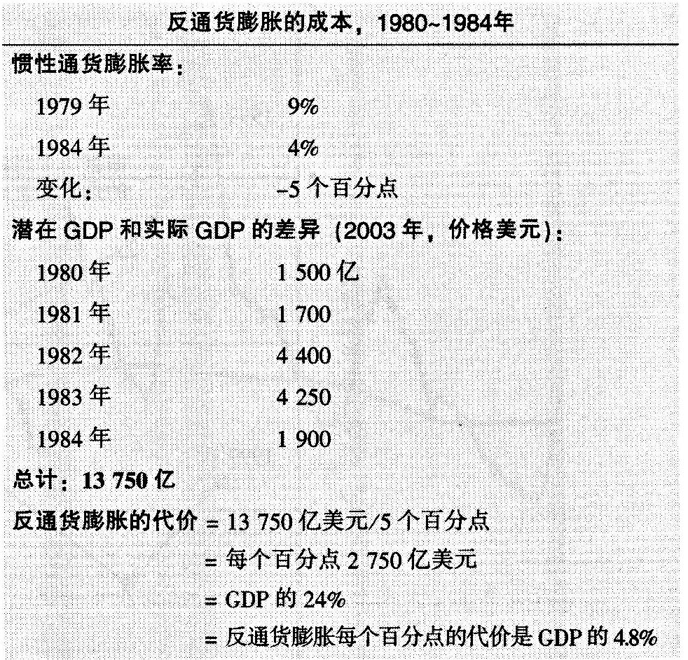 我们应当记得在第31章讨论过的奥肯法则。它表明:当失业率高于非加速通货膨胀的失业率2个百分点时,实际GDP就将比潜在的GDP水平下降4%。就2003年的情况来看,潜在GDP为10万亿美元(按1999年美元价格),要让通货膨胀率降低1个百分点,就必须使当年的反通货膨胀的成本,1980-1984年失业率大约提高2个百分点。于是,如果用美元来衡量,则降低1个百分点的通货膨胀率所要付出的代价将是:2%(2个百分点的失业率)x2%(失业率高于NAIRU时GDP下降的百分比)x10万亿美元GDP=4000亿美元。用另外一些方法估算,这一代价大约在2000亿~5500亿美元之间。