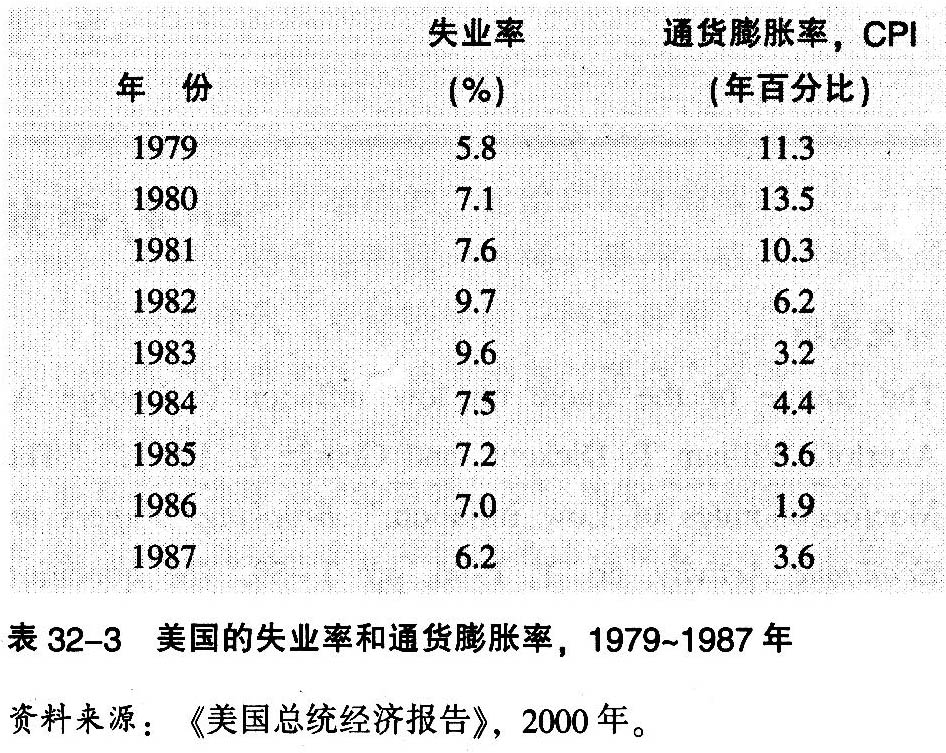 1980~1984年的大胆实验,为评论信用理论提供了良好的论据。在那个时期,政府以一种明确且强有力的姿态采取了紧缩性的货币政策,但所付出的代价却非常之大,正如表32-2所示。可见,使用硬性的和预先宣布的政策来增强信用,在美国似乎并不能有效地降低反通货膨胀的代价。