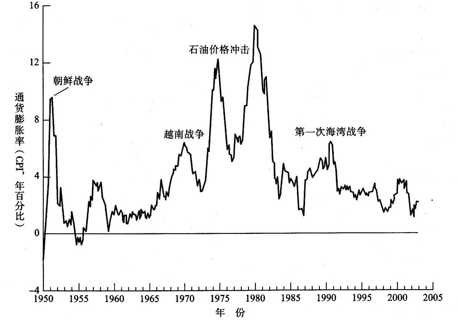在历史上,美国的通货膨胀率一直很不稳定,20世纪80年代初的通货膨胀率曾达到令人难以接受的高水平,而90年代由于美联储的有效控制和较小的供给冲击,通货膨胀一直稳定地保持在低水平。