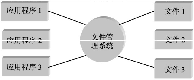 20世纪50年代后期至60年代中后期,计算机开始大量用于数据处理工作,大量的数据存储、检索和维护成为紧迫的需求。为了方便用户使用计算机,提高计算机系统的使用效率,产生了以操作系统为核心的系统软件,以有效地管理计算机资源。文件是操作系统管理的重要资源之一,而操作系统提供了文件系统的管理功能。在文件系统中,数据以文件形式组织与保存。文件是一组具有相同结构的记录的集合。记录是由某些相关数据项组成的。数据组织成文件后,就可以与处理它的程序相分离而单独存在。数据按其内容、结构和用途的不同,可以组织成若干不同命名的文件。文件一般为某一用户(或用户组)所有,但也可供指定的其他用户共享。文件系统还为用户程序提供了一组对文件进行管理与维护的操作或功能,包括对文件的建立、打开、读/写和关闭等。应用程序可以调用文件系统提供的操作命令来建立和访问文件,应用系统就成了用户程序与文件之间的接口。在这一阶段,程序和数据间的关系如图 1-3所示。