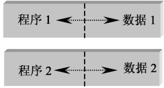 这一时期数据管理的特点是数据与程序不具有独立性。数据由程序自行携带,这就使程序严重依赖数据。如果数据类型、格式,或者数据量、存取方法、输入/输出方式等发生变化,程序就要做出相应修改。同时,因为没有统一的数据管理软件,数据的存储结构、存取方式、输入/输出方式等都由应用程序处理,这就给应用程序开发人员增加了很重的负担,并且效率较低。此阶段还有大量的数据冗余。由于数据是面向应用程序的,一个程序携带的数据,在程序运行结束后就连同该程序一起退出计算机系统。如果别的程序要共享该程序的数据,只能重新组织携带。因此,程序间经常会存在大量的重复数据。人工管理阶段的程序与数据的关系如图1-2所示。由图1-2可知,该阶段的数据在程序内部,程序和数据之间是一一对应的。