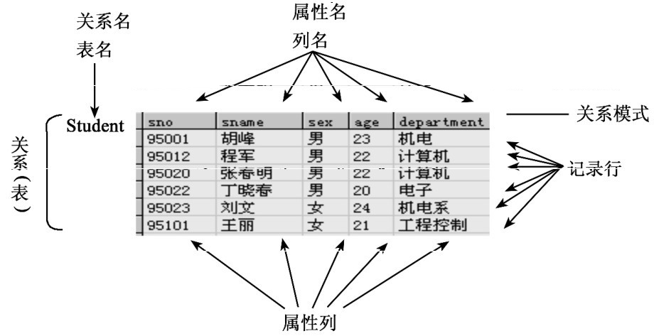 关系模式可表示为关系模式名(属性名1,属性名2,…,属性名n)的形式。例如,学生(学号,姓名,性别,出生日期,籍贯)。图1-8所示的关系模式可以表示为Student (sno,sname,sex,age,department)。