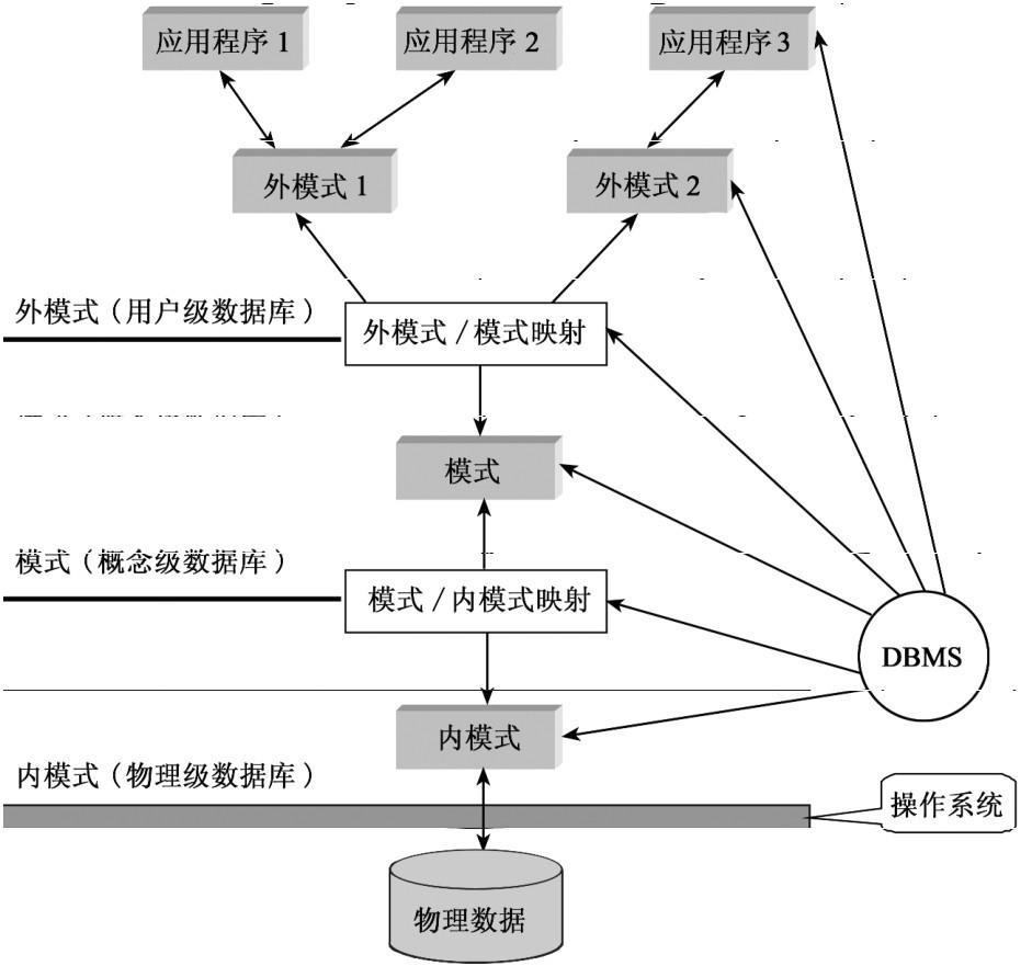 数据库系统的三级模式是数据库在三个级别上的抽象,把数据的具体组织留给数据库管理系统管理,用户就能够逻辑地处理数据,而不必关心数据在计算机中的具体表示方式和存储方式。为了能够在内部实现这三个抽象层次的联系和转换,数据库管理系统在这三级模式之间提供了两层映射: