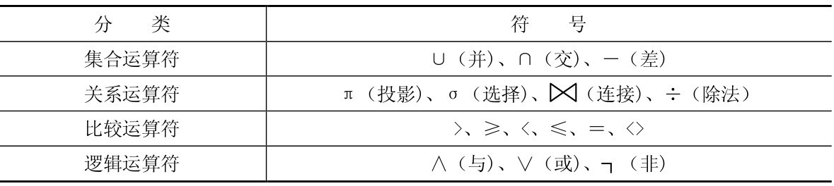 关系代数(Relation Algebra)是一种抽象的查询语言,是关系数据操纵语言的一种传统表达方式,是用对关系的运算来表达查询的。任何一种运算都将运算符作用于一定的运算对象上,以得到预期的运算结果。关系代数的运算对象是关系,运算结果也是关系。关系代数用到的运算符包括集合运算符、关系运算符、比较运算符和逻辑运算符四类,如表2-4所示。