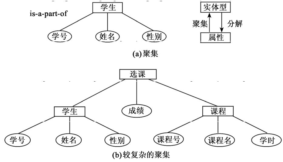 更复杂的聚集是将一些实体型作为部分结构,形成更复杂的实体。在图4-12(b)中,我们将“选课”抽象成了一个实体型,而之前是抽象成一种联系,这也说明实体和联系的概念是相对的,它们之间可以相互转换。