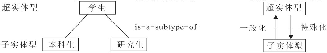 这里,学生称为超实体型(Super Entity Type)或超类(Superclass),本科生或研究生称为(学生的)子实体型(Sub Entity Type)或子类(Subclass)。一般化抽象了从子实体型到超实体型之间的“is-a-subtype-of”或“is-a-kind-of”的语义。