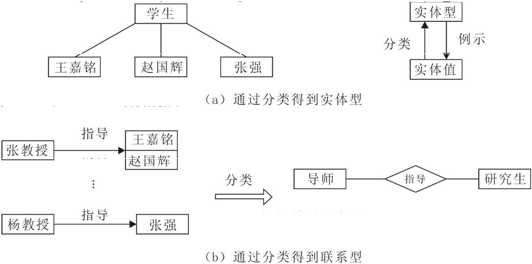 进一步扩展分类的概念,可以认为两个实体型之间的联系型,也是从多个具有某些共同特性的联系实例中通过分类抽象而得到的。例如,导师“指导”研究生,就是从多个具体的“指导”个案中,通过分类而得到的(见图4-10(b))。