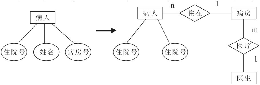 例如,在医院中,一个病人只能住在一个病房,病房号可以作为病人实体的一个属性;但如果病房还要与医生实体发生联系,即一个医生负责几个病房的病人的医疗工作,则病房根据准则(2) 应作为一个实体。E-R图如图4-16所示。