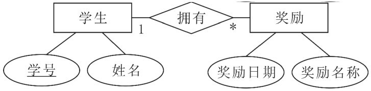 例如,一个学生实体有一项奖励属性,由于学生在学校里可能会有多项奖励,每项奖励由奖励日期和奖励名称组成,所以该属性是多值属性。当E-R图转成关系模式时,把该属性处理成一个联系型,名称为拥有,如图4-15所示。