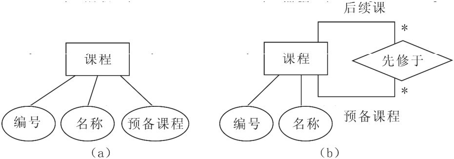 例如,实体型课程具有课程编号、名称和预备课程三个属性,如图4-14(a)所示。一门课程可能有也可能没有预备课程,可能有一门也可能有多门预备课程,所以,预备课程是一个多值属性。由于预备课程也是实体型课程的实体,因此,可以把预备课程更改为一个联系型,如图4-14(b)所示。
