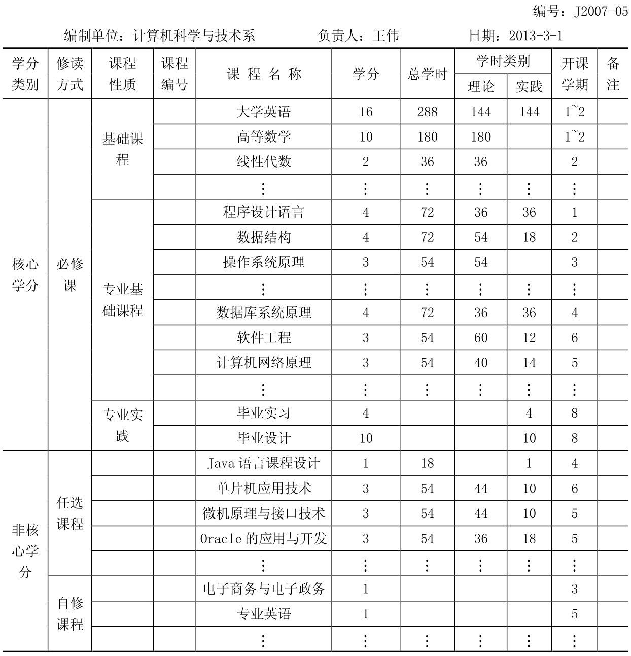 制订专业培养计划工作由教务处组织各系的主任及教授完成。一份专业培养计划规定了该专业学生应学习的各门课程。对于本科生和本科教学而言,这是一份四年计划,是指导日常教学工作的重要文件。表4-1所示是一份较典型的专业培养计划的实例。