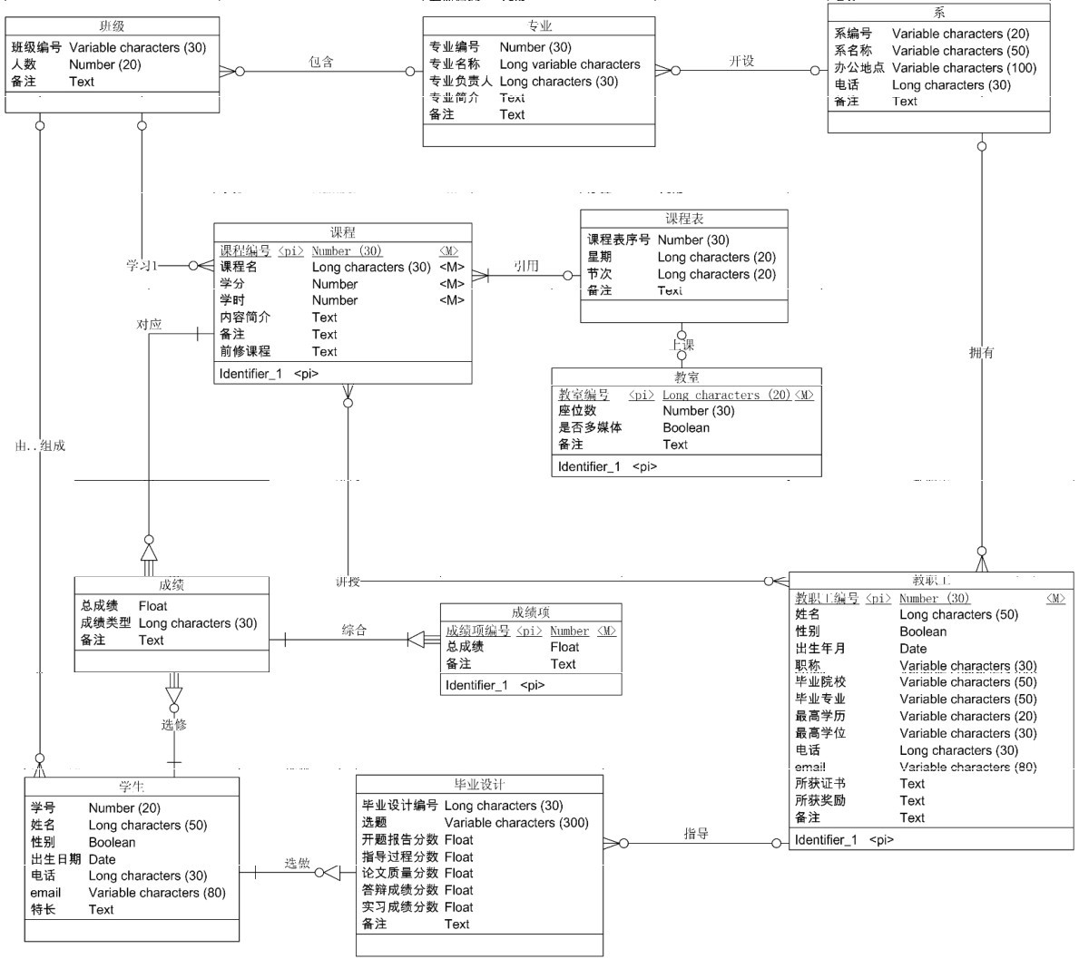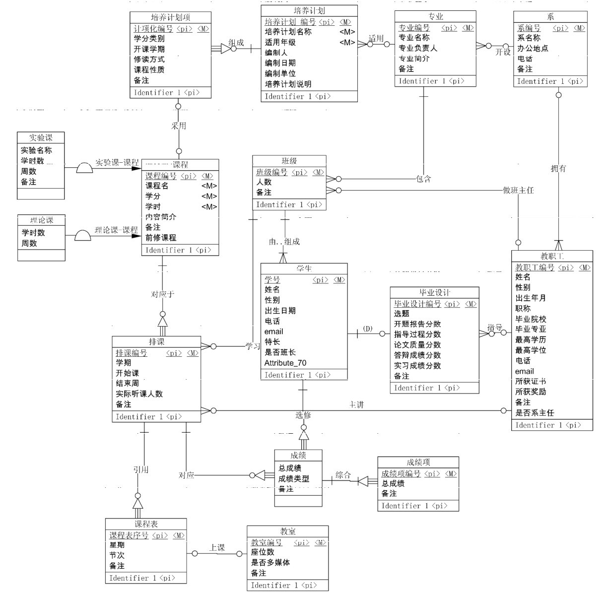 教职工除了指导学生的毕业设计、上课外,部分教职工还可能要做班主任、系主任,应在汇总图中增加对应的联系和属性。同时每个班上还有班长,班长也是一名普通学生,应在学生实体增加是否班长属性。