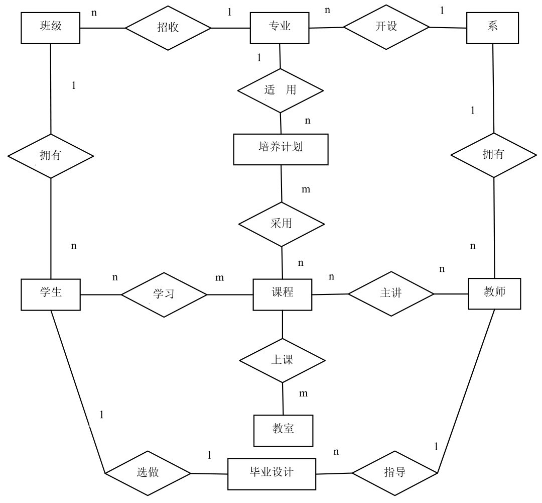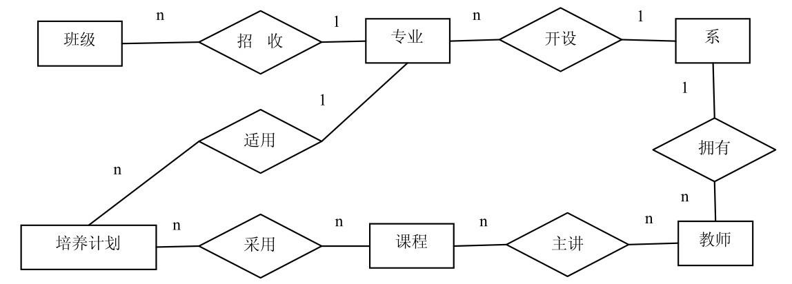 根据前面的说明,我们可以抽取相关的实体系、专业、班级、学生。在一个系里,有多个专业,每个专业有多个班级,班级里有多个学生。每个专业都有自己的培养计划。同一个专业的教学计划也在不断修订,以反映学科的进步和市场的需要,所以同一专业、不同年级的培养计划可能是不同的。