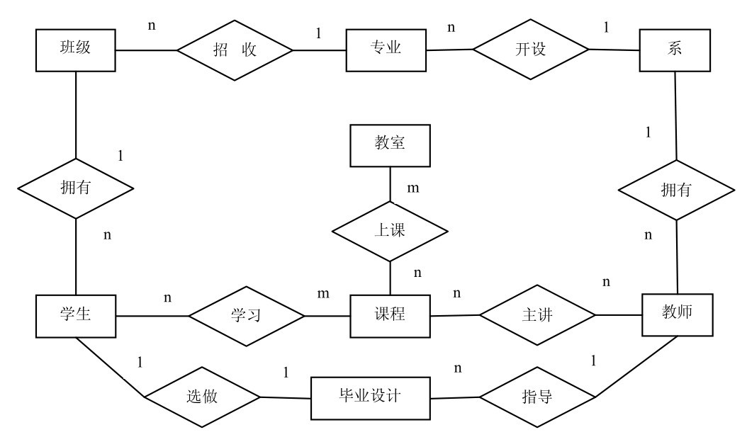 通过以上活动所需数据的分析,我们可以在抽取学生实体、教师实体和课程实体的基础上增加毕业设计实体。这些实体之间存在对应的关系,如学生学习课程,教师讲授课程;学生选做毕业设计,教师指导毕业设计;由于每一门课都在教室里上,所以增加了抽取教室实体。通过反复的设计与调整,可得到反映日常教学活动的E-R图,如图4-20所示。