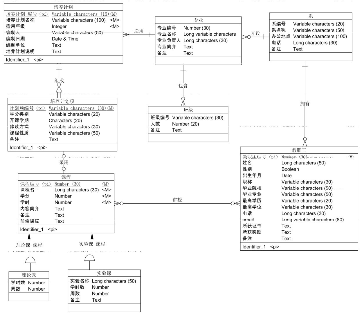 在概念模型设计中,如果出现实体中的属性有一对多的关系,如培养计划表中有多行的课程信息,则应单独抽出一个实体培养计划项来表达为每一行代表的课程。由于培养计划项是必须依托于培养计划而存在的,所以它们之间是一种依赖关系。同时每一门单独的课程则被培养计划项所采用。同样,对于每一门课程,有理论课和实践课的区别,它们继承课程的数据,但是又有自己独有的数据属性。由此得到另外一种使用Power Designer软件画出的crow的foot模型图,如图4-19所示。