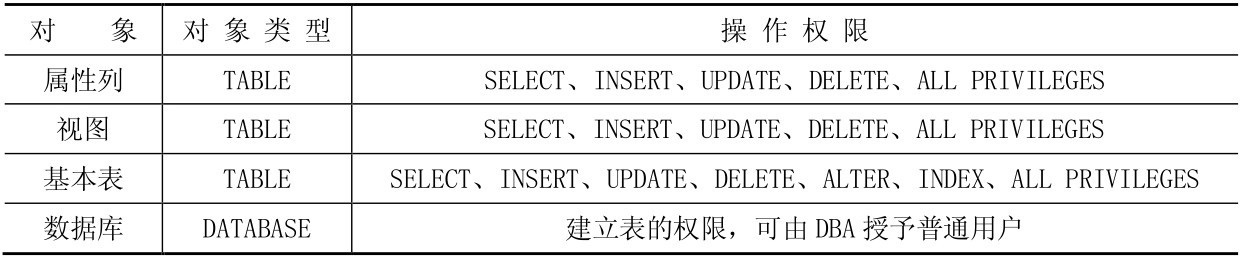 对于数据库,可以有建立表(CREATE TABLE)的权限,该权限属于DBA,可由DBA授予普通用户,普通用户拥有此权限后可以建立表,表的属主拥有对该表的一切操作权限。